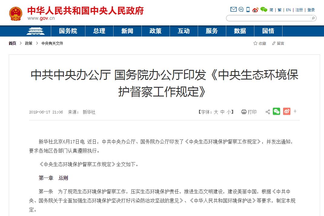 近日,中共中央办公厅、国务院办公厅印发了《中央生态环境保护督察工作规定》,并发出通知,要求各地区各部门认真遵照执行。全文如下: